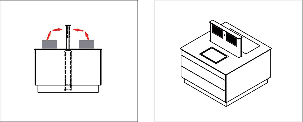 Diese Sonderanfertigung der Hub-Tischlüftung macht es möglich, von zwei Seiten den Dunst abzuziehen.