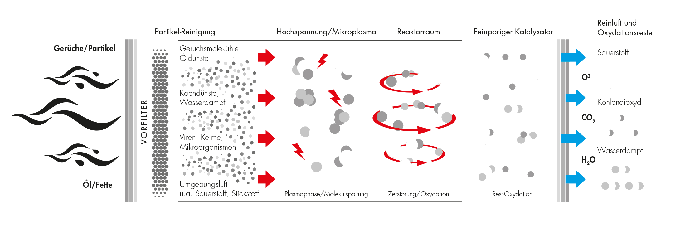 Nach der Vor-Filterung erfolgt die Einleitung eines auf Plasma basierenden Reaktions- und Oxidationsprozesses. Beim Durchströmen einer Hochspannungs-Entladungsquelle, die sich allerdings mit nur 20 Watt Leistungsaufnahme begnügt, wird der Kochdunst mit atomaren oder, fachmännisch, Singulett-Sauerstoff angereichert. So wird ein Zersetzungs- und Oxidationsprozess initiiert, bei dem die Kohlestoffverbindungen entweder zu Reaktionen angeregt werden oder direkt mit dem Sauerstoff reagieren.