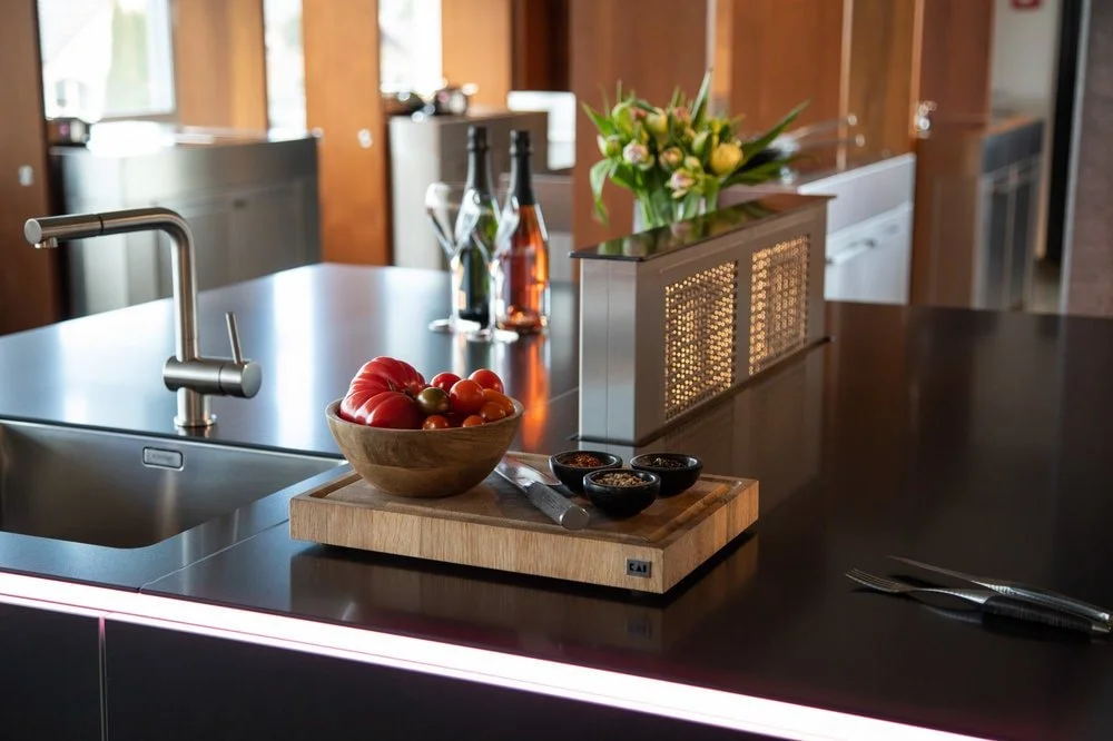 Im Kochbereich unter dem Ceranfeld liegen mittig ein runder sowie links und rechts jeweils zwei leistungsstarke eckige Induktoren, die sich jeweils für grössere Bratpfannen zusammenschalten lassen. Mit einer in der Glasfläche eingelassene Hubtischlüftung mit DomaPlasma® Technologie lässt sich die neue Kochinsel zudem beliebig im Raum platzieren. Dem Umbauprojekt sind so keine Grenzen gesetzt.